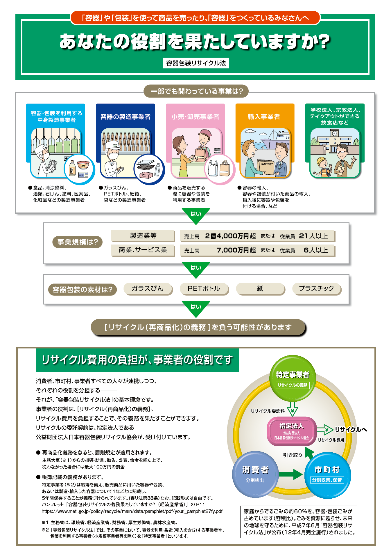※【再商品化(リサイクル)の義務】を負う特定事業者に該当するか否かは、公益財団法人日本容器包装リサイクル協会コールセンターにご相談ください。
