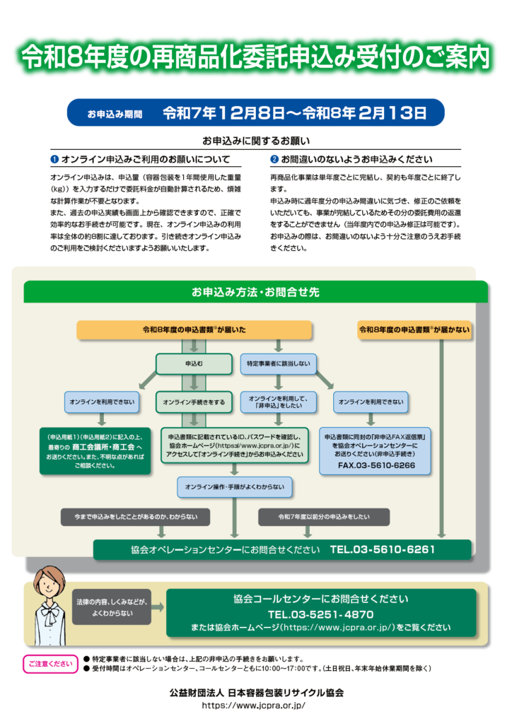 公益財団法人日本容器包装リサイクル協会 コールセンター TEL:03-5251-4870